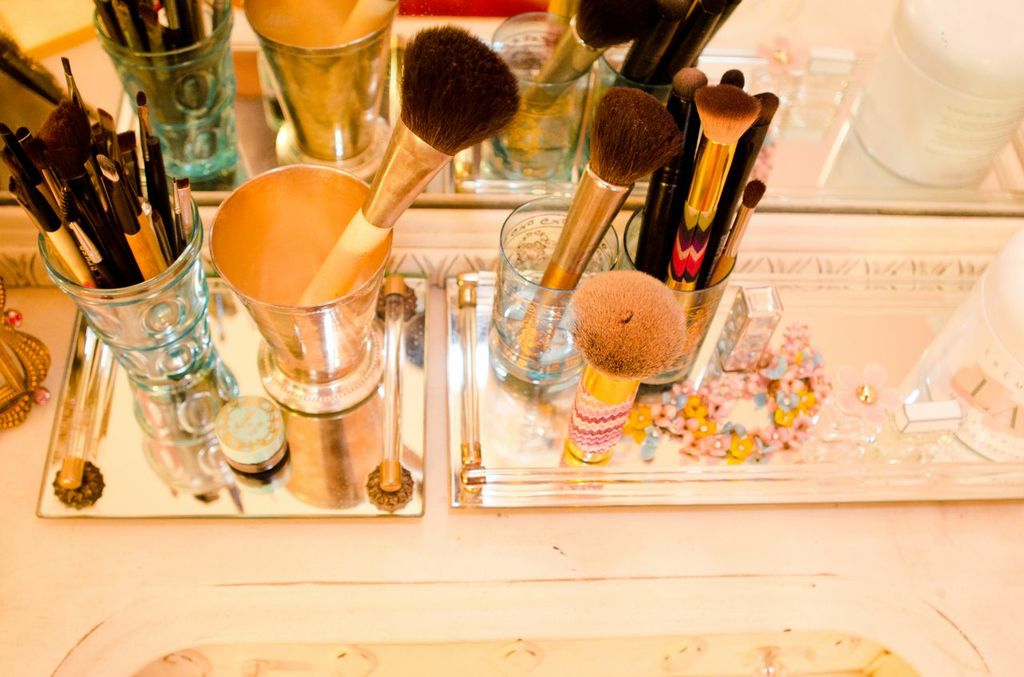 In this case, I used this prime (and pretty) opportunity to do this with my makeup brush holders. Why not give those expensive investments, called brushes, a lovely home? I opted for julep cups and blue sea glass cups and votives.